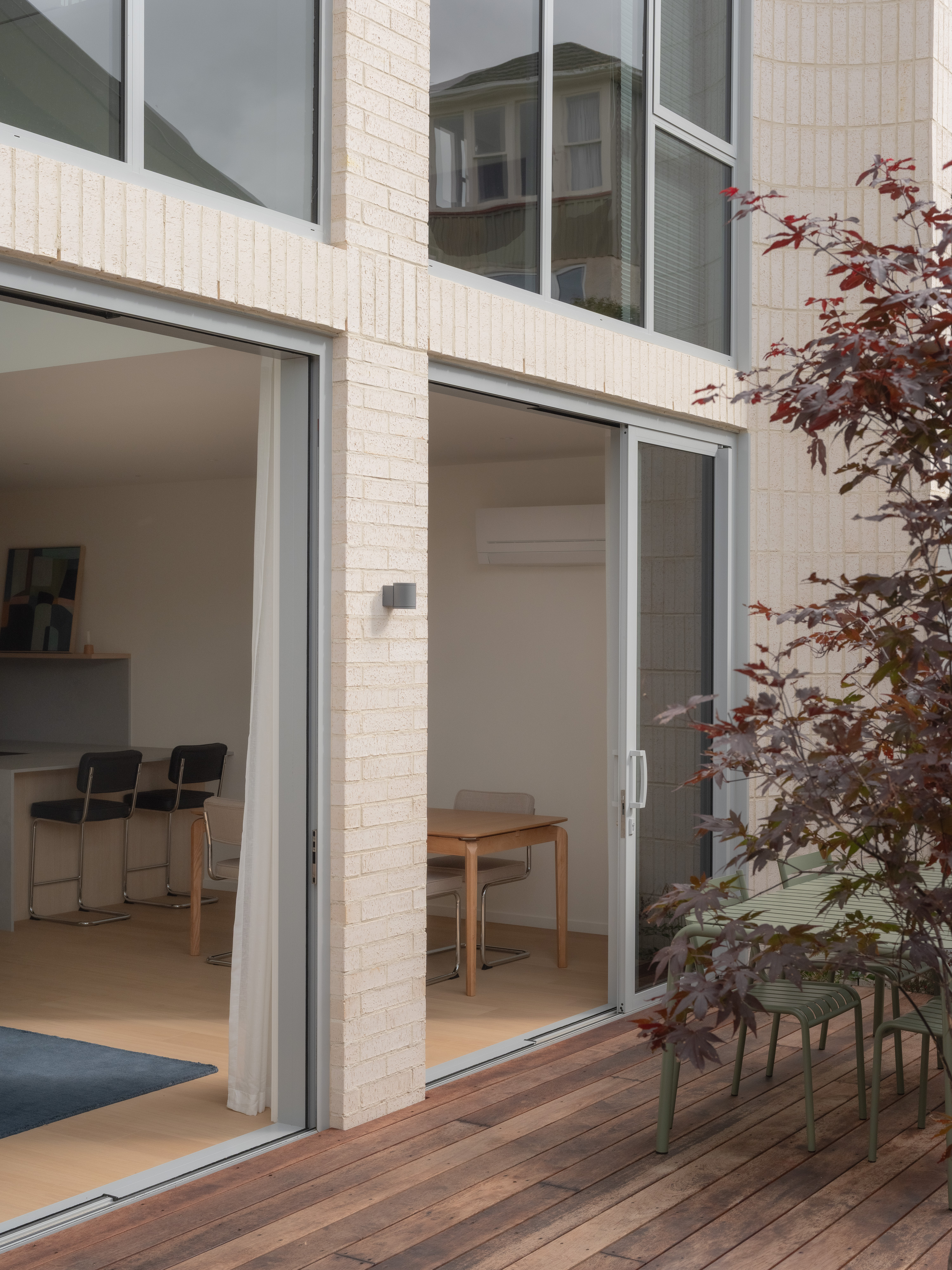 A minimalist aesthetic flows seamlessly throughout, featuring high-end finishes that elevate everyday living. The considered townhomes span a spacious 163 sqm, each home is designed to enhance light, space, and comfort. Double-height voids over the living areas, 2.7-metre ceilings, and floor-to-ceiling windows create an airy, open environment. Skylights over the bathrooms and hallways bring in natural light, reinforcing a sense of warmth and refinement.